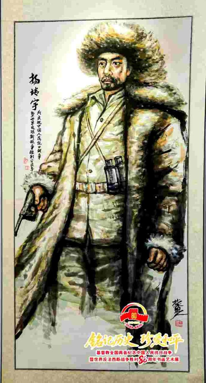 杨靖宇将军的大半身画像,以中西合璧的艺术语言书写着英雄的传奇。作者运用国画的写意笔法勾勒将军的身形,笔墨间带着一种苍劲的力量感,将军衣衫的褶皱处理简洁却富有层次,既符合国画 “以形写神” 的追求,又暗合其在东北林海雪原中艰苦抗战的岁月痕迹;而西洋画的写实技巧则在人物面部得到充分展现,将军脸颊的风霜、眼角的细纹被细致描摹,却丝毫不见疲惫,反而透出一种 “越是艰险越向前” 的坚韧与豪迈。整幅画在色彩与光影的交织中,将杨靖宇将军为民族解放事业鞠躬尽瘁、死而后已的崇高精神具象化。观者凝视画作,仿佛能听到他在冰天雪地里与敌人周旋的呐喊:“区区日本四岛,断无亡我中华之力!我虽华夏一匹夫,然堂堂七尺须眉,抗日救国之信仰,坚如磐石,今日得以血溅山河,我足矣!”藉着画作可以感受到那份穿越时空的爱国情怀与精神力量。