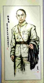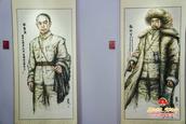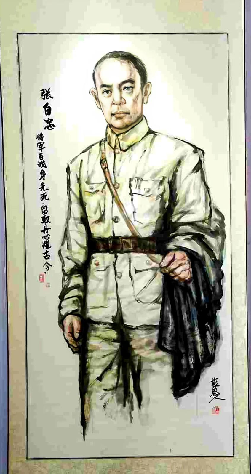第二幅是取自抗战英雄张自忠将军殉国后各界掉念诗文“将军百战身先死,留取丹心耀古今”为题画的。这幅大半身的张自忠将军画像,是中西绘画技法融合的生动实践。作者以国画的淡墨渲染铺陈底色,勾勒出将军身着军装的挺拔轮廓,线条遒劲有力,尽显军人的刚毅风骨;同时巧妙融入西洋画的明暗对比手法,在将军的面部细节处着重刻画——深邃的眼眸中透着坚定的信念,紧锁的眉头似承载着民族危亡的重任,嘴角的线条紧绷却不失沉稳,将将军在抗日前线运筹帷幄、临危不惧的精神气度精准传递。画作没有刻意渲染战场的激烈,却通过对人物神态的细腻捕捉,让观者感受到张自忠将军 “捐躯赴国难,视死忽如归” 的英雄气概。每一笔色彩、每一处光影都饱含着对先烈的崇敬之情,仿佛能让人穿越时空,与这位抗日名将的精神产生强烈共鸣。